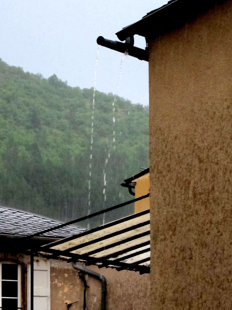 Pluie d'été sur les Cévennes - Un 23 juillet, ce n'est pas à proprement parler une pluie cévenole, mais un gros orage d'été. Remarquer le fractionnement du filet d'eau qui sort des gouttières : je cherche un texte littéraire en rapport et je vous explique ! |